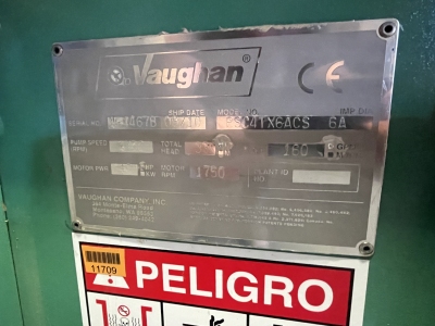 Two Vaughan Chopper pumps designed for pumping headworks process rags and screenings. Units have been stored indoors with periodic shaft rotation. Units are in good working condition, but will benefit from some basic service/maintenance (oil change, mechanical seal inspection, etc.). In service for 1 year, stored indoors for 12 years.1750 RPM, 160GPM, 33’ Total Head.