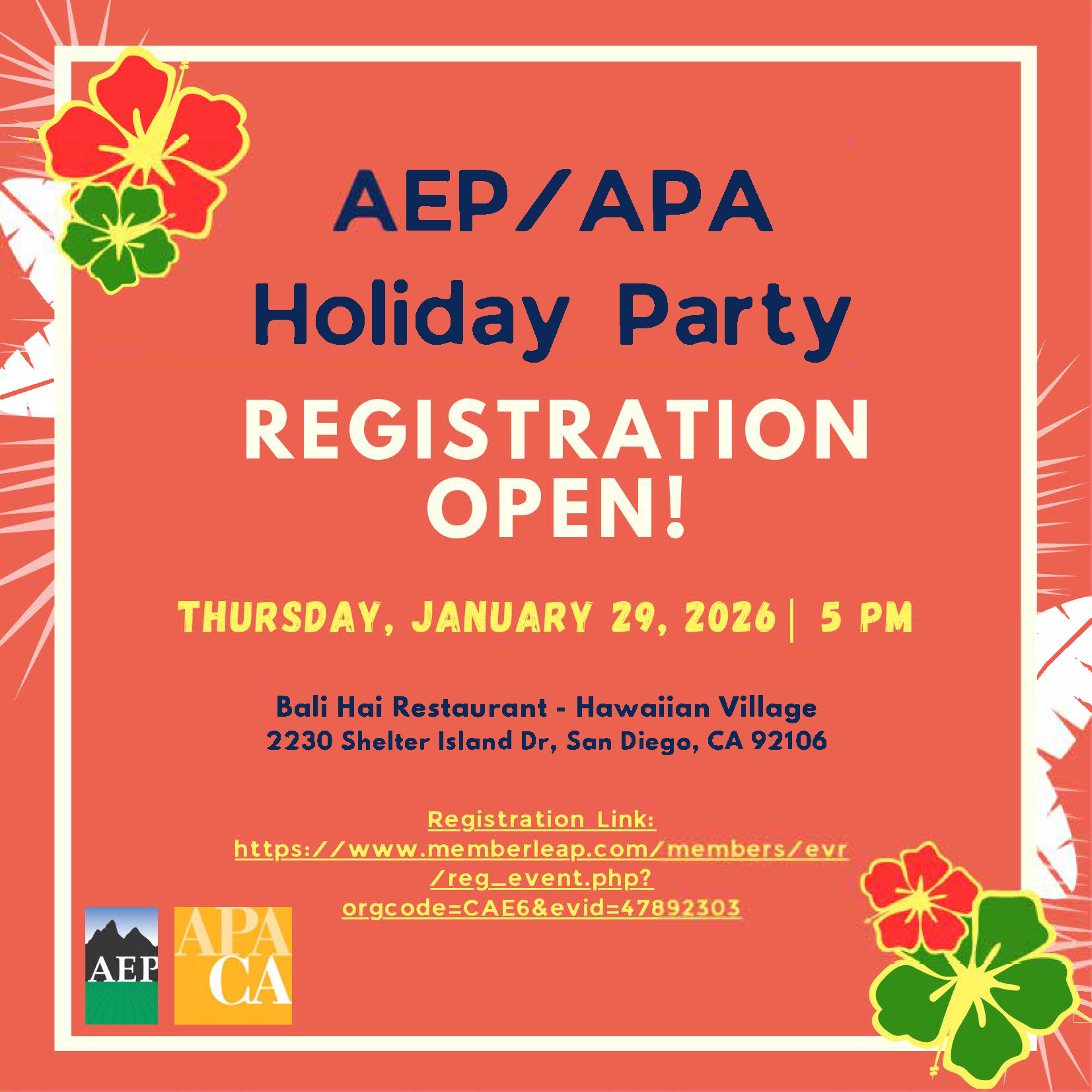 The AEP and APA San Diego Chapters are excited to announce the 2026 Holiday Party will be held at Bali Hai Restaurant on Thursday, January 29th from 5:00pm to 9:00pm.