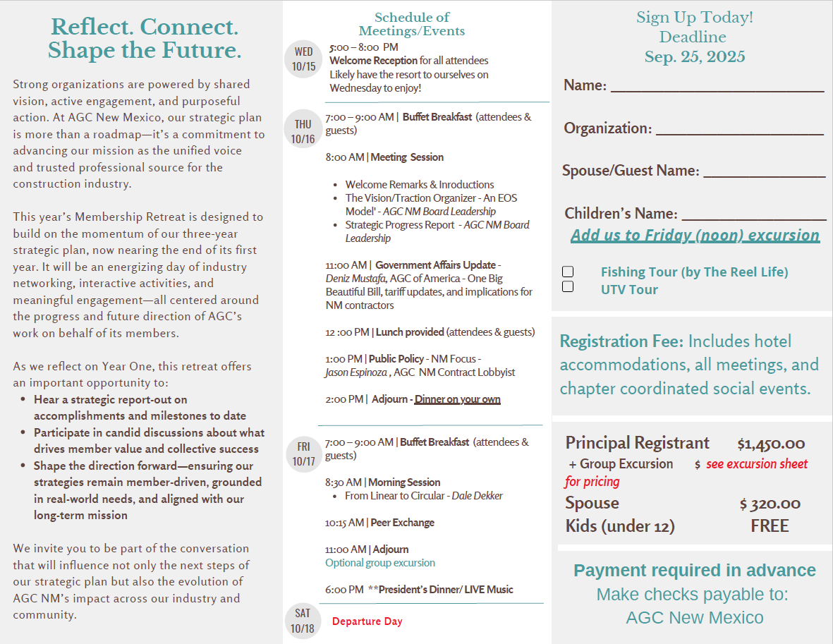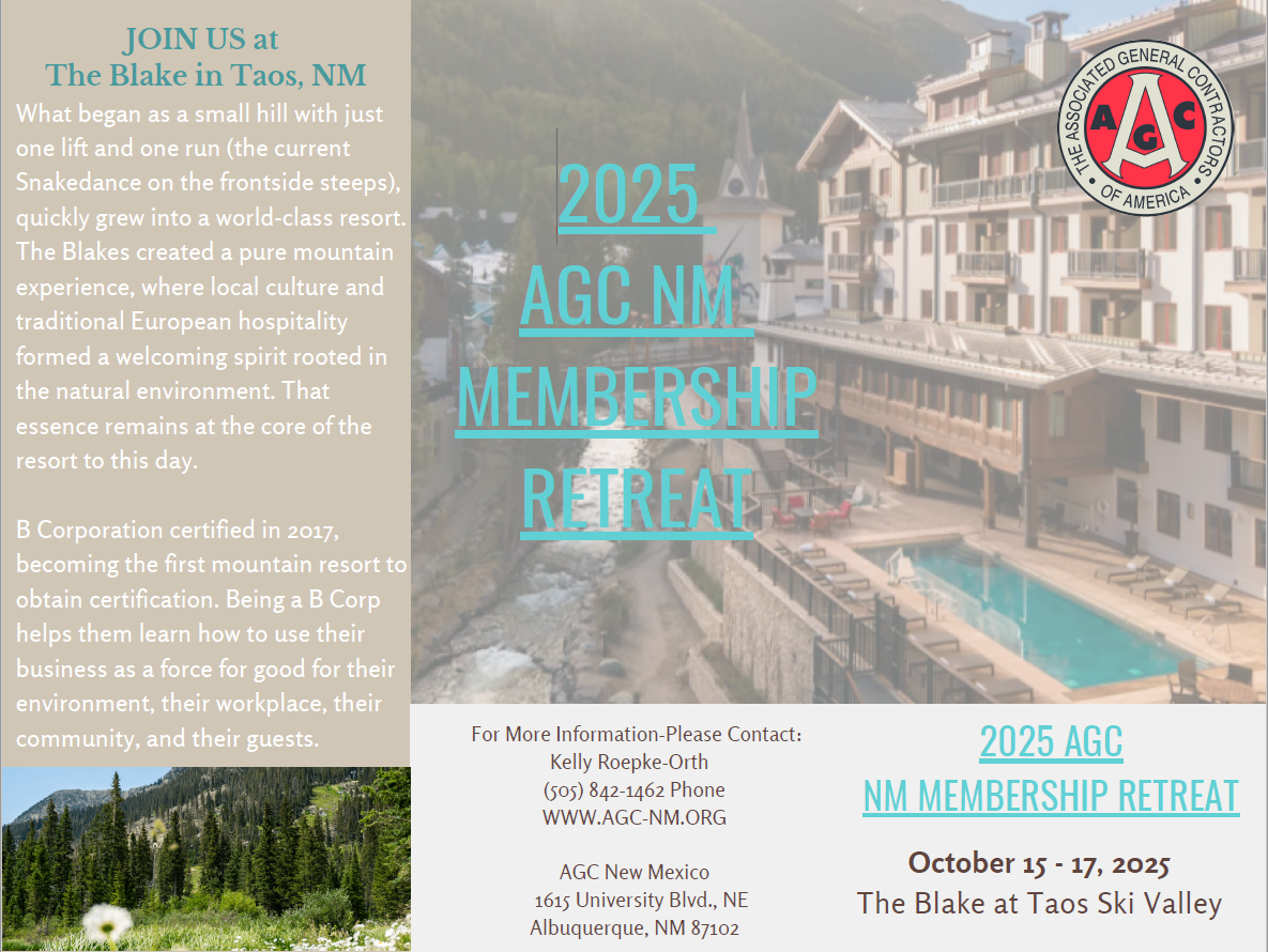 This year’s Membership Retreat is designed to build on the momentum of our three-year strategic plan, now nearing the end of its first year. It will be an energizing opportunity for industry networking, interactive discussions, and meaningful engagement, all centered on the progress and future direction of AGC’s work on behalf of its members.