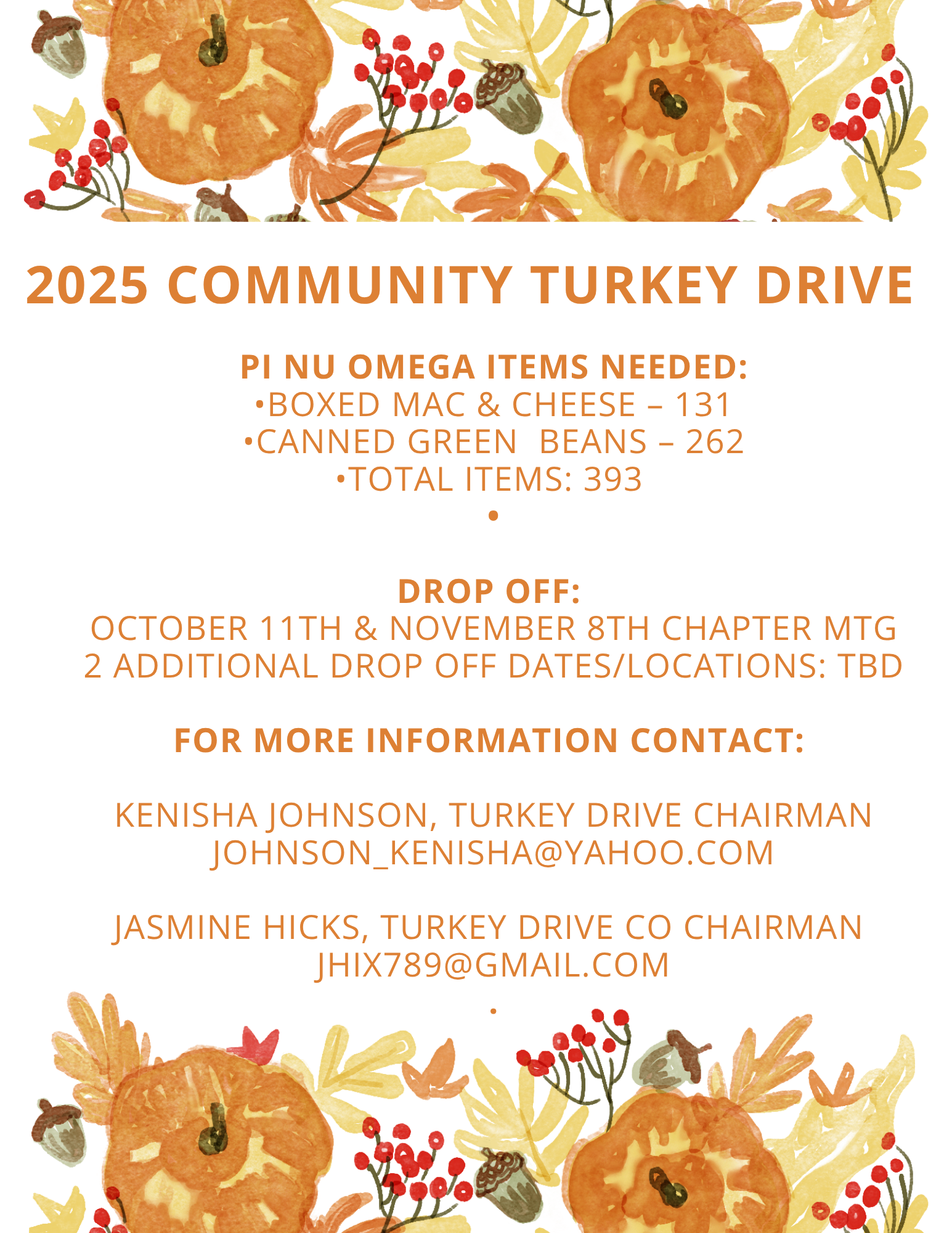 This year, we’re partnering with the Murfreesboro NPHC for a joint community effort! Pi Nu Omega has proudly committed to collecting 131 boxes of macaroni and cheese and 262 cans of green beansa total of 393 items to help families in need this season.