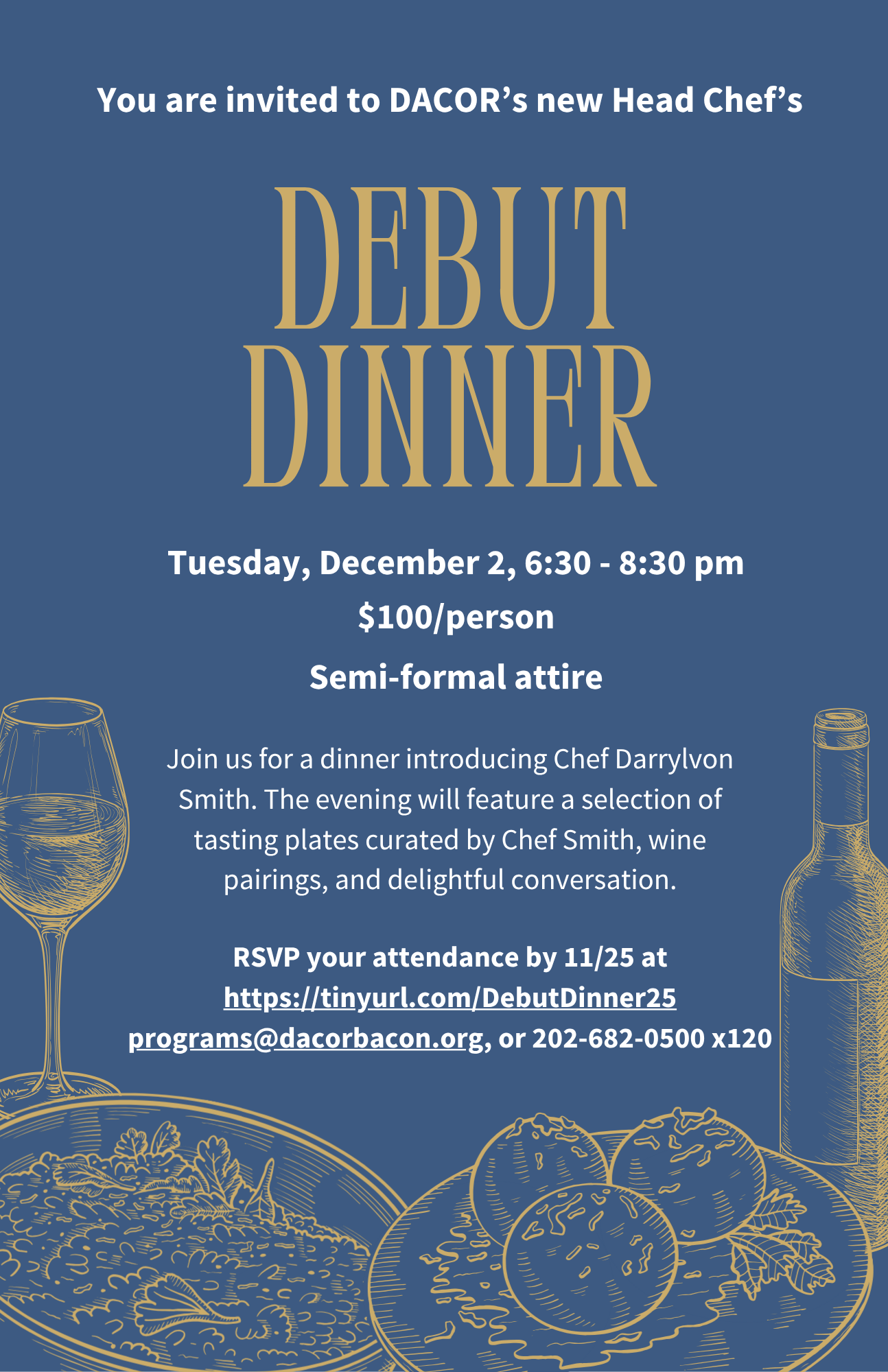 You are invited to a special debut dinner introducing the new Head Chef of DACOR, Darrylvon Smith. Chef Smith has prepared a menu featuring an hors d'oeuvre, 3 delectable courses, and a dessert for the evening to showcase his talent. The event will begin with a reception at 6:30 pm followed by dinner seating at 7 pm. Chef Smith will introduce the evening's dishes, which will be accompanied by paired wines.