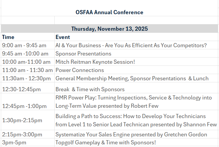The OSFAA Annual Meeting is more than just an association meeting; it is your opportunity to elevate your business, your team, and your success! This year’s agenda is packed with sessions designed to deliver real-world strategies, fresh insights, and actionable takeaways that you can implement immediately. |