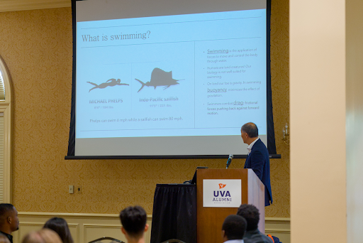 Following the parallel presentation sessions and section business meetings, folks made the brief walk to Alumni Hall for the lunch programming. After a filling catered lunch of fajitas, attendees heard remarks from the VAS executive committee as well as a recorded greeting from Senator Mark Warner. Headlining the lunch programming was the Sidney S. Negus Memorial Lecture, this year given by Professor Ken Ono, the STEM Advisor to the Provost and Marvin Rosenblum Professor of Mathematics at UVA. Professor Ono’s fascinating talk (summarized in greater detail in a dedicated article) focused on the success of his work integrating data analytics into training and strategy for the UVA Swim Team and Team USA at the Olympics. The afternoon continued with more invited talks and a poster session held in the Chemistry building atrium, in which 100 student researchers shared their work.
