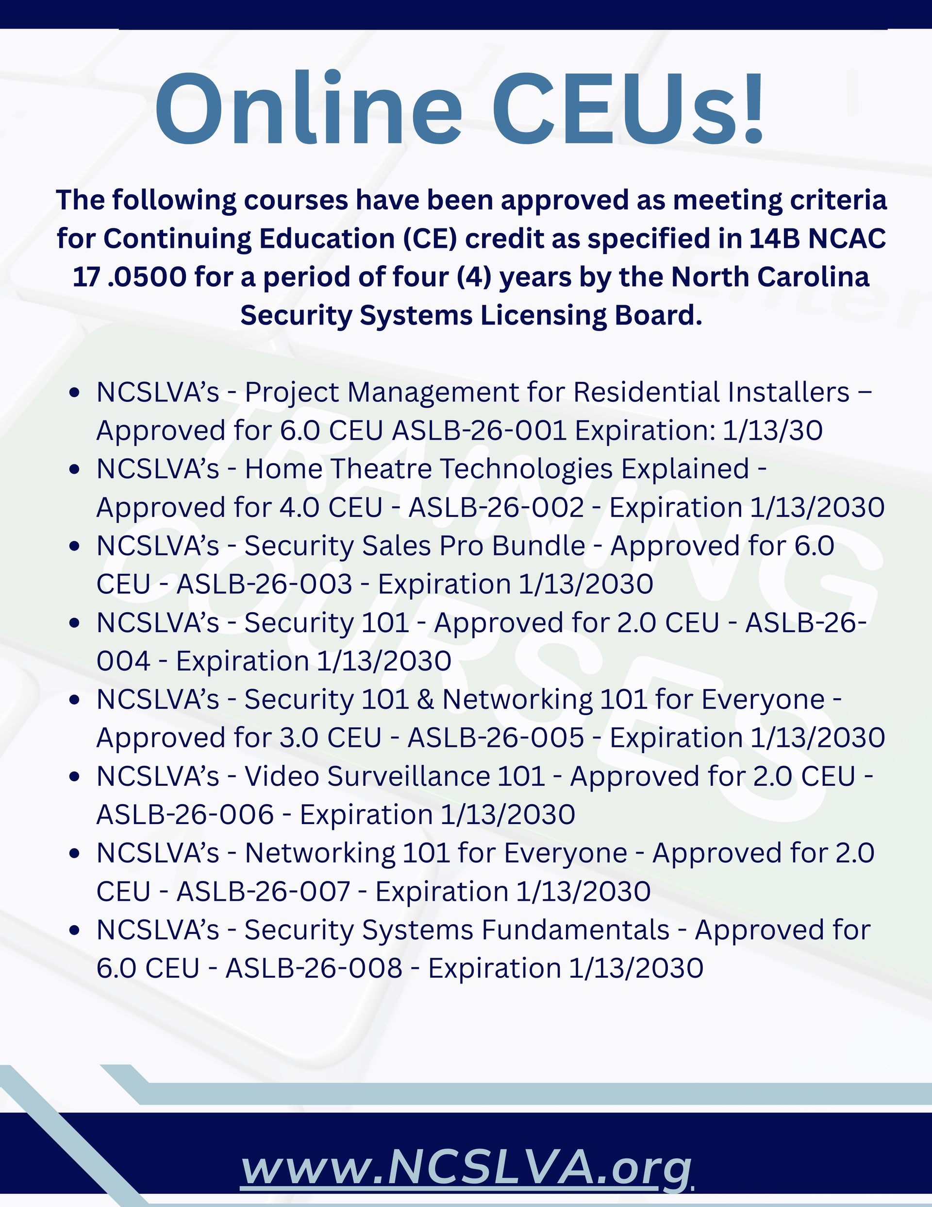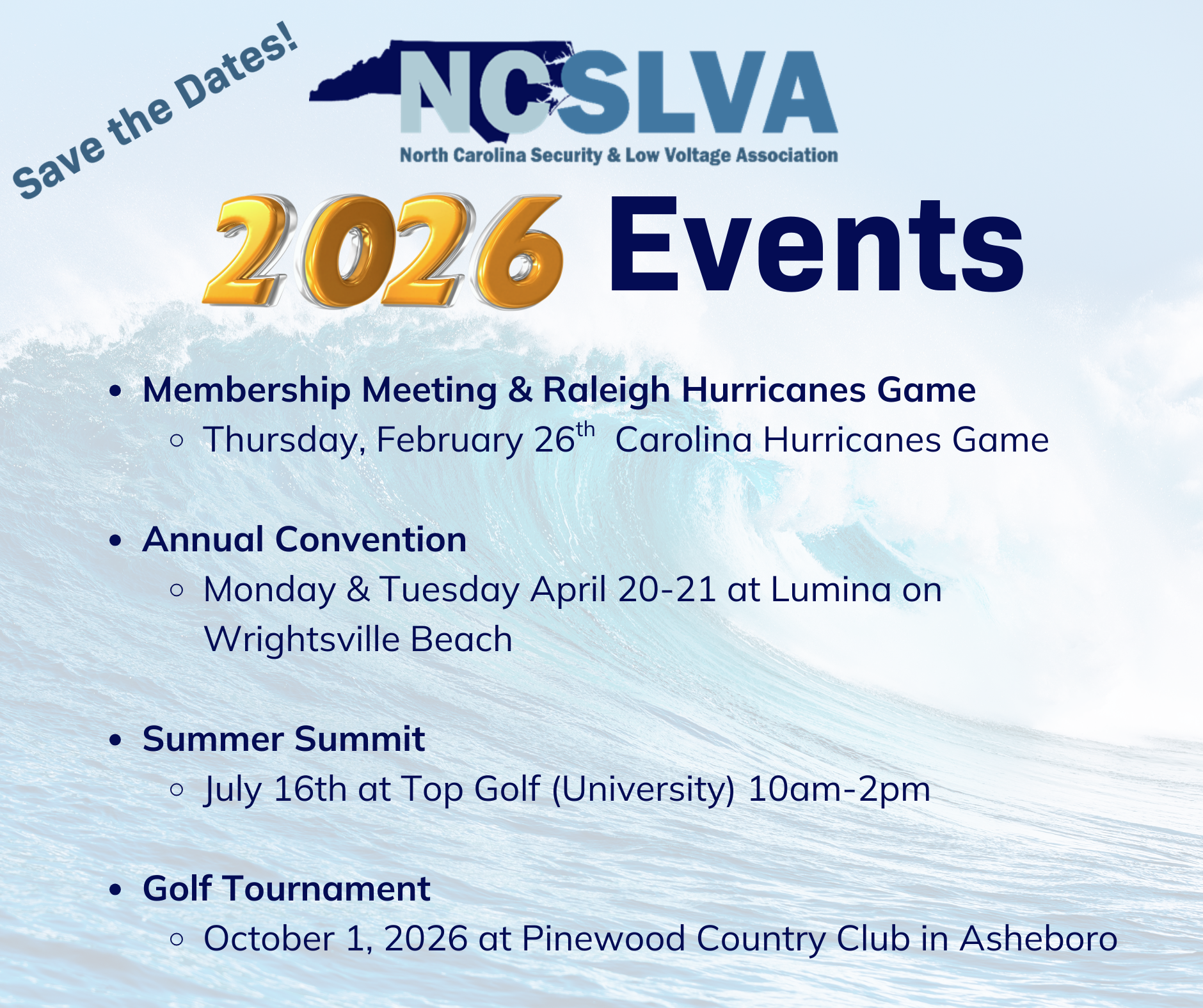 I’m excited to share several positive developments as we continue building momentum for the North Carolina Security& Low Voltage Association (NCSLVA). We have launched our new website and our association is growing stronger, more engaged, and more focused than ever on delivering meaningful value to our members and industry professional across the State. Please keep an eye out for an email from our new system that will include your login information later today.
