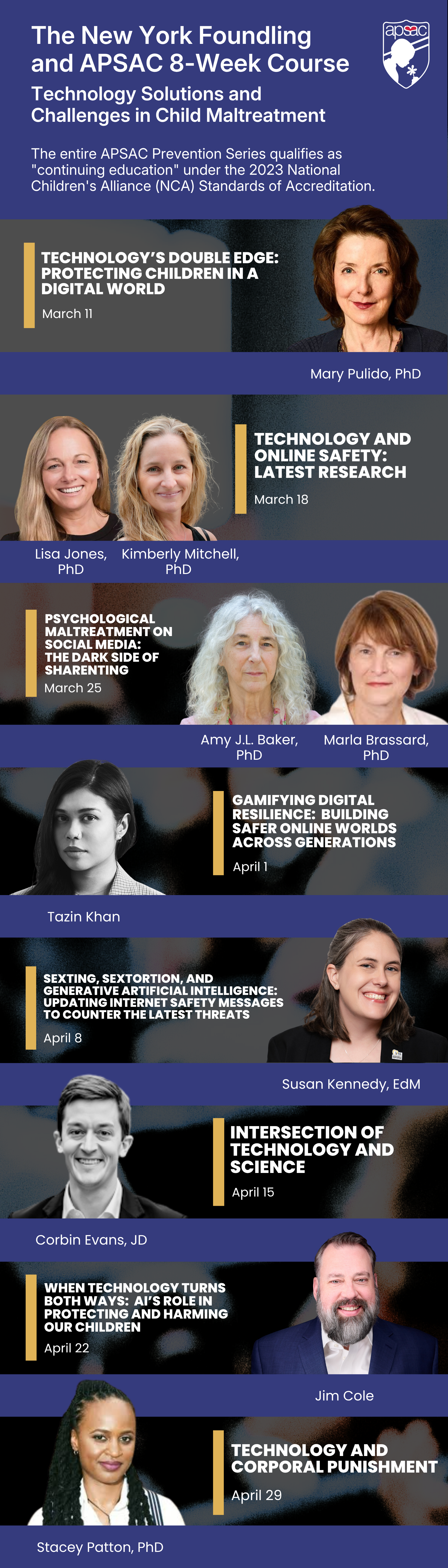 The APSAC Prevention Series returns in 2026 will be held on the 3rd Thursday of the month. This is a monthly opportunity to learn from leading experts in child maltreatment prevention and child well-being offered to expand your toolkit with the strategies and resources needed to implement effective prevention practices and improve outcomes for children and families. Member Registration: Free Non-Member Registration: $149 APSAC MEMBERSHIP INFORMATION January 15, 2026: presented by Pastor Dan Broyles and Dr. Michael Rauso February 19, 2026: presented by Erin Taylor, PhD March 19, 2026: presented by Esaa Mohammad Samarah & Bart Klika, PhD April 16, 2026: presented by Jennie Noll, PhD May and June: Summer Break July 16, 2026: presented by Sallye R. Longshore, MS, EdS & Andrea Darr August 20, 2026: presented by Mellissa Bright, PhD & Jenny Coleman, LMHC November 19, 2026: presented by Vincent J. Palusci, MD, MS, FAAP, FAPSAC September 17: presented by Darrell L. Armstrong, EdS-MFT, MDiv, DDiv, FAPSAC October 15: presented by Anne Day Leong, PhD December 17, 2026: presented by Corinna Jenkins Tucker, PhD, CFLE & Tanya Rouleau Whitworth, PhD more info... | 1/15/2026 -12/17/2026 | 1:00pm to 2:00pm | ||||||||||||||||||||||||||||||||||||||||||||||||||||||||||||||||||||||||||||||