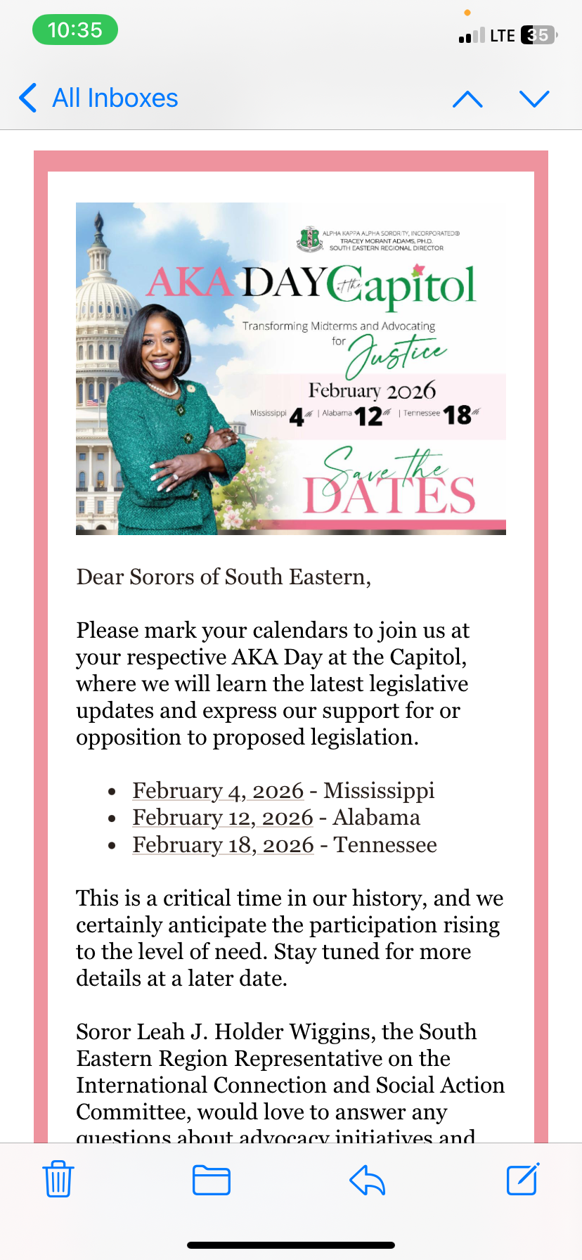 Soror Katina Semien Smothers is a certified candidate for the position of First Supreme Anti-Basileus of Alpha Kappa Alpha Sorority, Incorporated®. She will be hosting a Zoom meeting with the Pi Nu Omega and Eta Psi chapters on Sunday, February 22, from 4:00 p.m. to 5:00 p.m. The Zoom link will be provided soon. more info...