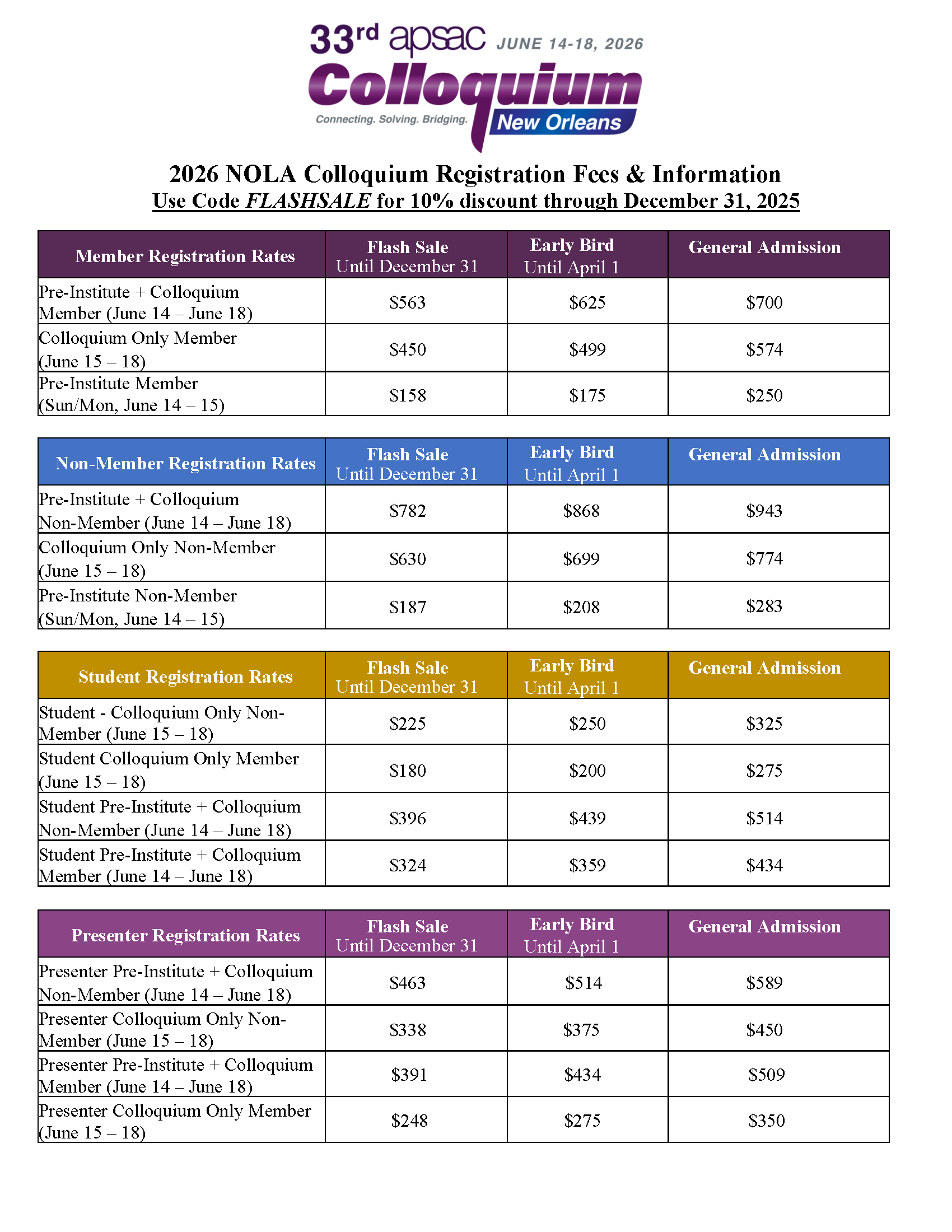 | 6/14/2026 -6/18/2026 | Theme: Connecting. Solving. Bridging. For over three decades, the APSAC Colloquium has been a cornerstone for professionals and researchers working to prevent and respond to child maltreatment. Now in its 33rd year, this go-to conference continues to bring together the field’s most respected voices and emerging innovators for a one-of-a-kind learning and networking experience. The 33rd APSAC Colloquium brings together professionals, researchers, and advocates who believe that real progress happens when we connect across disciplines, solve with shared purpose, and bridge gaps in systems, communities, and understanding. Set in vibrant New Orleans, where collaboration and culture meet, this year’s gathering invites voices to come together -where various voices harmonize like jazz, creating bold, lasting solutions for children and families. For the third year in a row, the Colloquium returns to New Orleans—a city where scholarship meets soul. Attendees don’t just come for the sessions—they return for the connection, culture, and community. Past participants have paraded in second lines, joined jazz-infused bar crawls, and built meaningful collaborations over beignets and bold ideas. Group Registration Discounts Cancellations: APSAC adheres to a No Cancellation and No Refund policy. This long-standing approach is consistent with industry standards for nonprofit conferences and reflects the significant planning and financial commitments that each registration represents. Registration fees cover costs such as venue requirements, materials, and food & beverage which are arranged in advance based on expected attendance. For this reason, all registration fees are final upon submission. Transfer Requests: Unpaid Registrations We appreciate your understanding and continued support of APSAC’s mission to promote excellence and accessibility in the field of child maltreatment prevention and response.