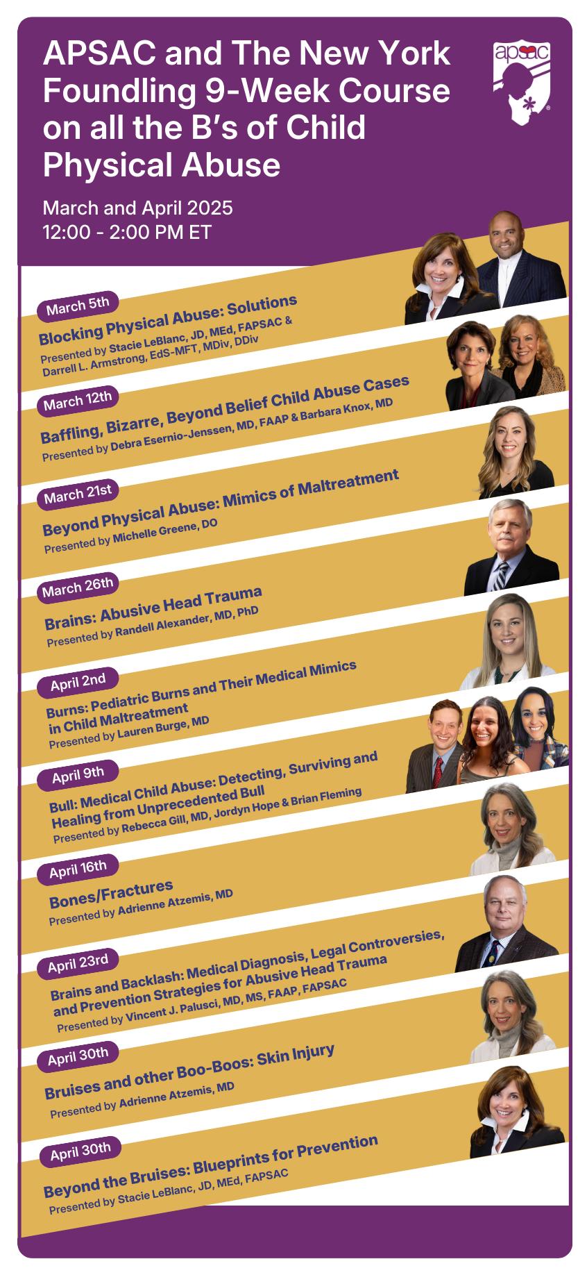All sessions will take place from 12:00pm to 2pm ET once a week from March 5th to April 30th, 2025 remotely through the use of live interactive webinars over Zoom.