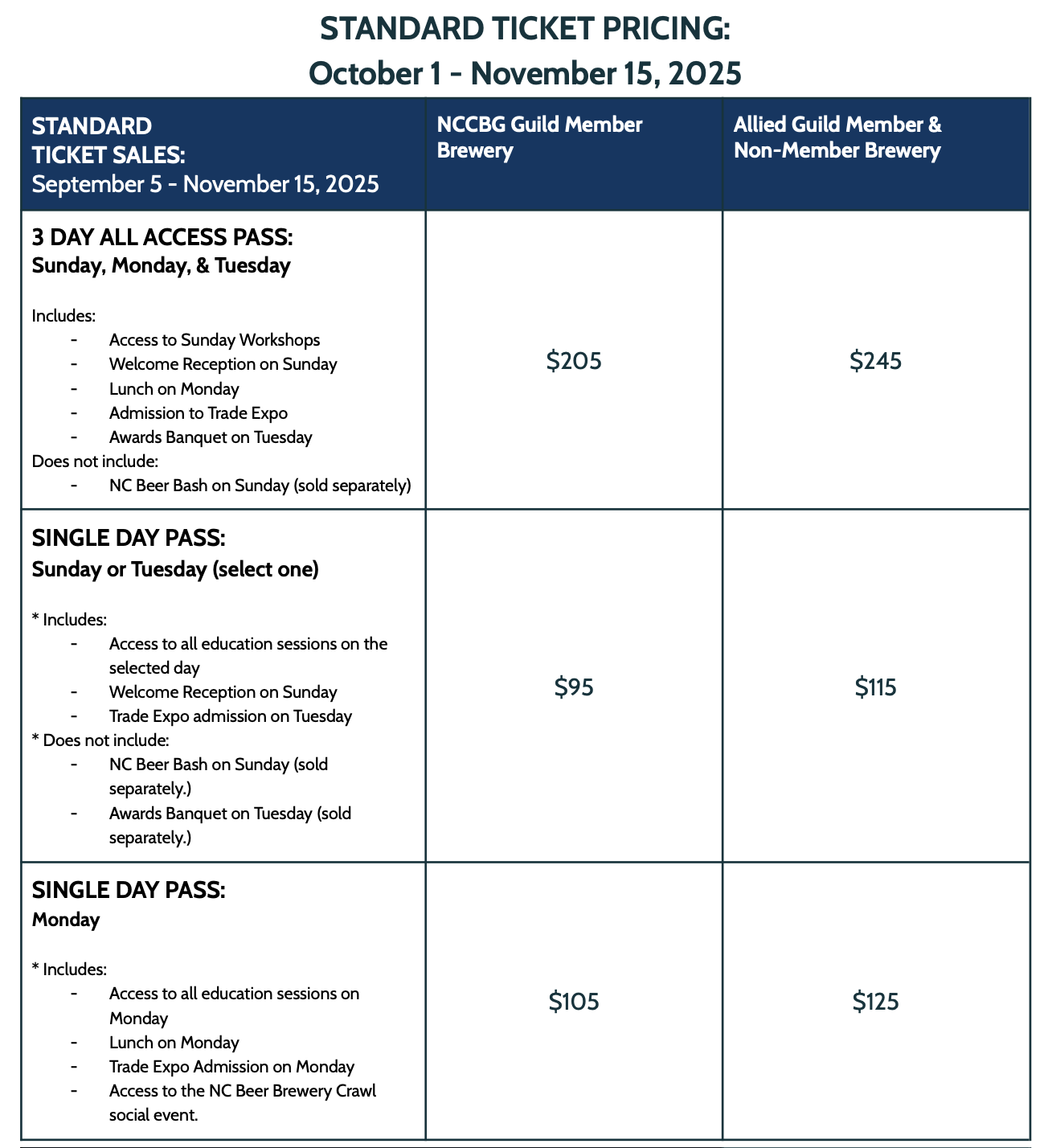 Note: Only the All-Access Pass includes admission to the NC Beer Industry Awards Banquet.