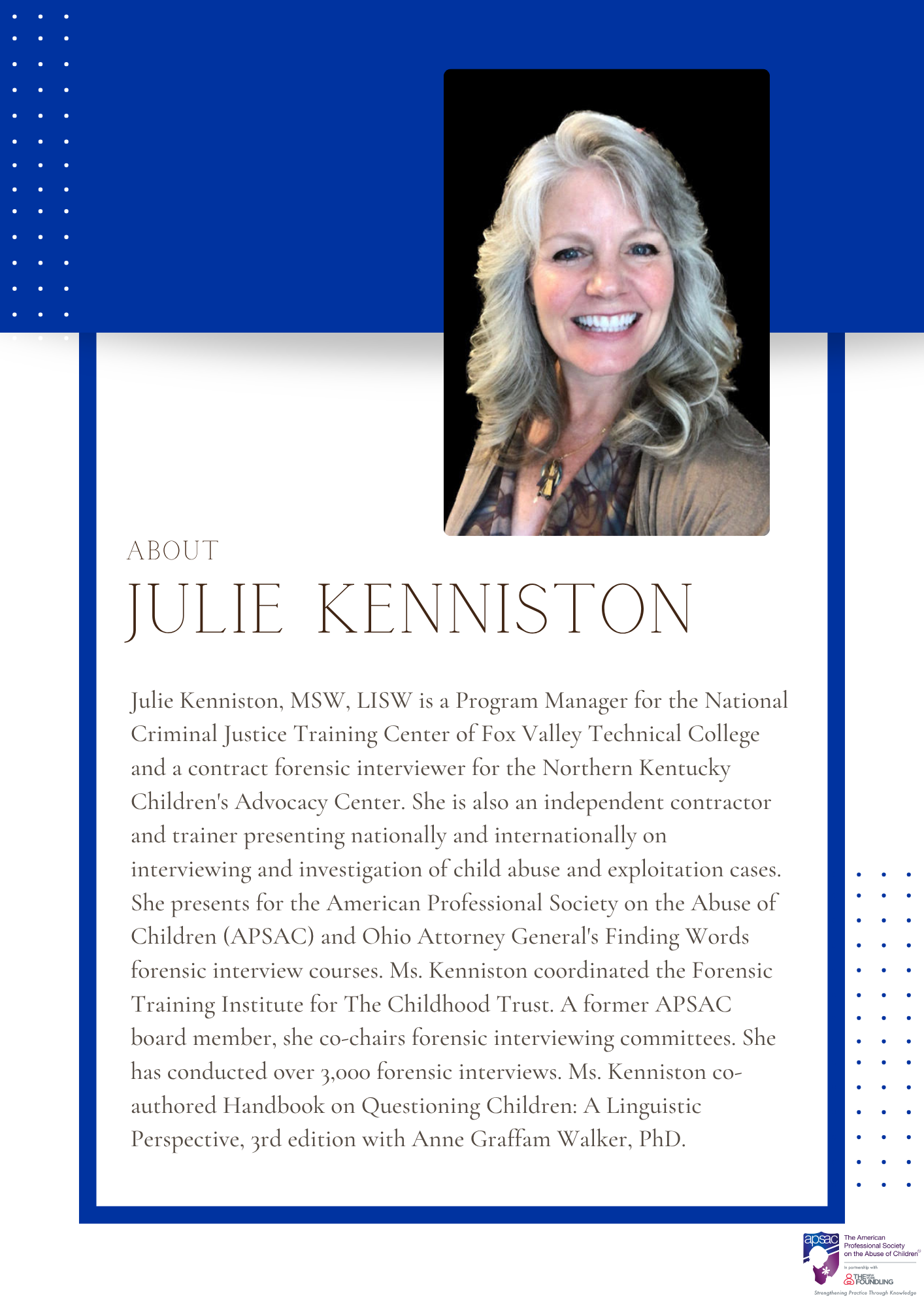 Social Work: The American Professional Society on the Abuse of Children (APSAC), provider #1622, is approved as a provider for social work continuing education by the Association of Social Work Boards (ASWB ), www.aswb.org, through the Approved Continuing Education ( ACE ) program. APSAC maintains responsibility for the program. ASWB Approval Period: 7/27/2025-7/27/2028. Social workers should contact their regulatory board to determine course approval for continuing education credits. The Social worker participating in this conference received 1 continuing education clock hours.”