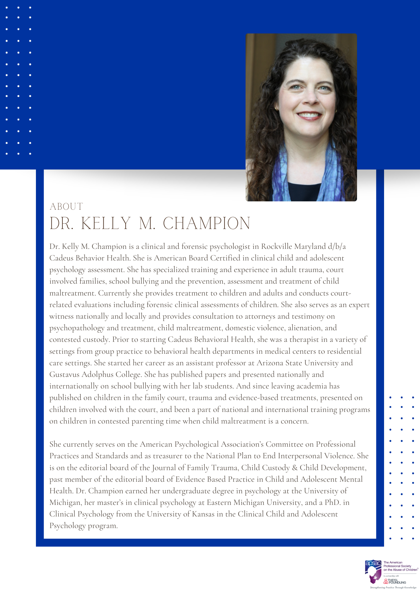 Psychology: The American Professional Society on the Abuse of Children, Inc (APSAC) is approved by the American Psychological Association (APA) to sponsor continuing education for psychologists. The American Professional Society on the Abuse of Children maintains responsibility for this program and its contents.