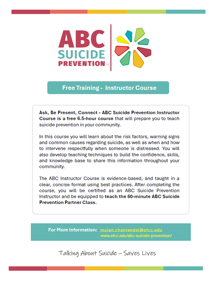We’re offering a FREE ABC Suicide Prevention Instructor Course, a 6.5-hour training that prepares you to teach suicide prevention in your community.
