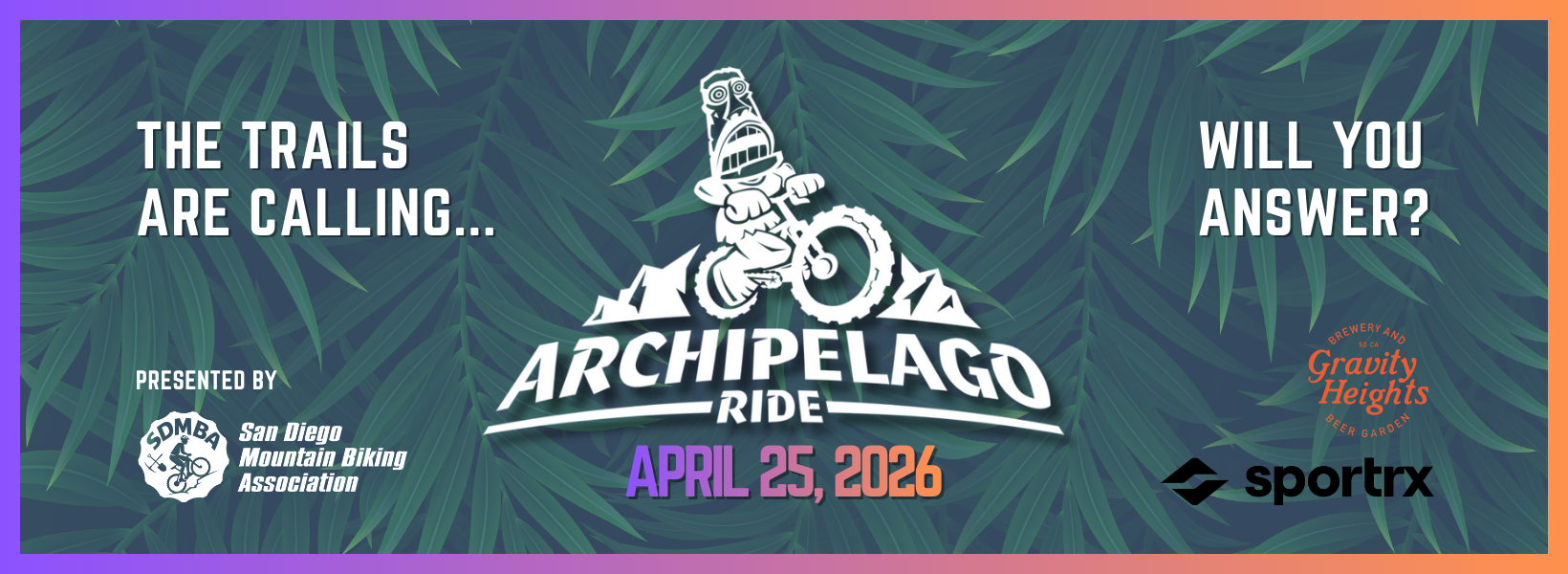 Welcome to registration for the 2026 Archipelago Ride! Join over 500 riders for San Diego’s iconic annual mountain bike ride!