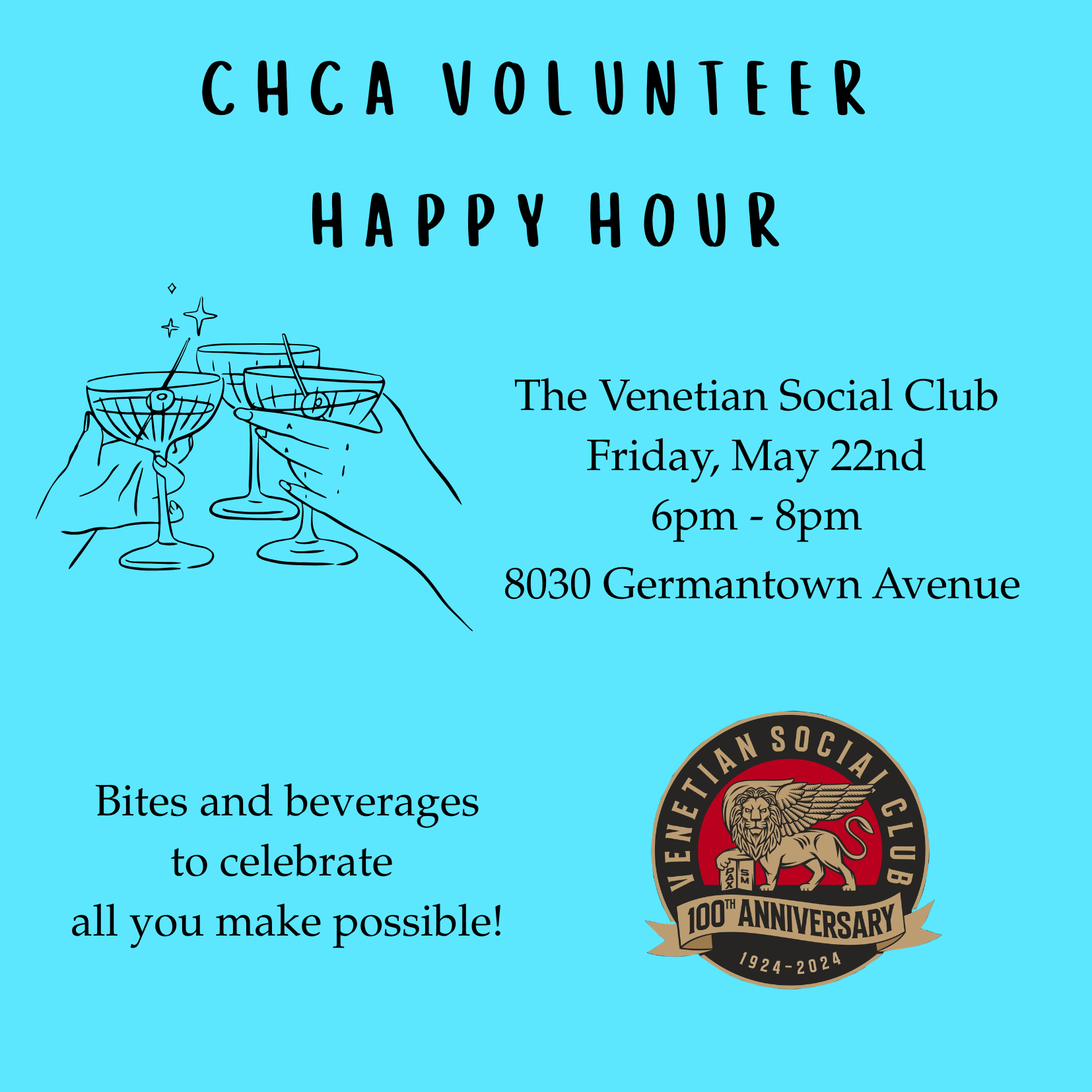 Come join us on Friday, May 22nd from 6-8pm at the The Venetian Social Club to grab a bite, a drink, and catch up with your fellow volunteers. We also invite community members interested in volunteering with us to stop by and learn about some of the exciting opportunities we have coming up this year!