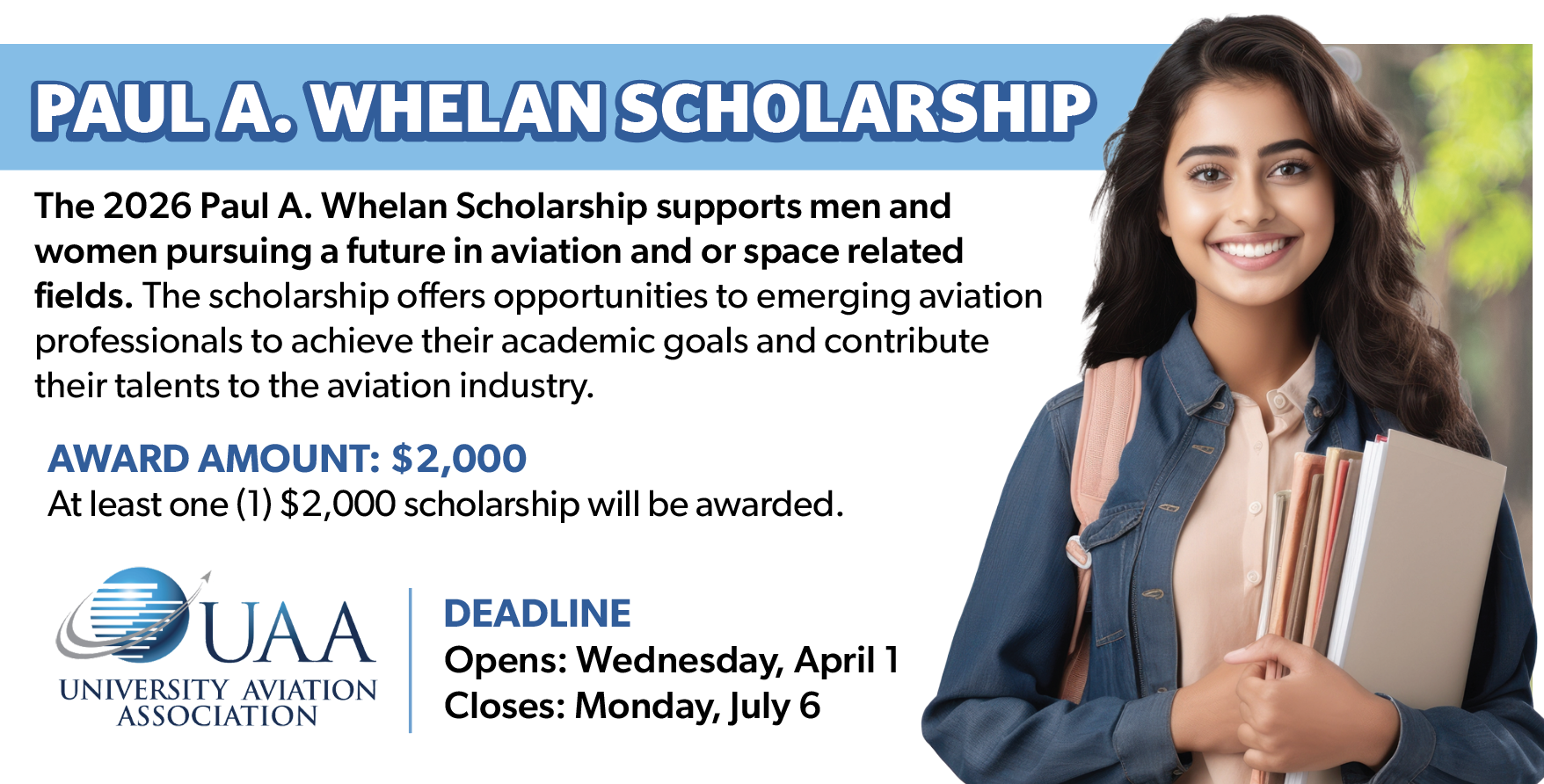 In the memory of an exemplary aviation educator, under the auspices of the University Aviation Association (UAA). The Fund supports men and women pursuing a future in aviation and/or space-related fields. The scholarship will provide opportunities to emerging aviation professionals to achieve their academic goals and contribute their talents to the aviation industry. Dr. Whelan exemplified leadership in aviation throughout his life. He served 25 years as an Air Force aviator and retired as a colonel after a career that included combat service in Korea and Vietnam for which he received the Distinguished Flying Cross, the Bronze Star and the Air Medal. In addition to flying, he was a professor of history at the U. S. Air Force Academy, chair of the Air Force Institute of Technology history department and on staff at the Air War College. In his own academic career, Dr. Whelan earned his bachelor's degree from Holy Cross College, his master's from the University of Tennessee, and his doctorate in history from St. Louis University. Upon his Air Force retirement, Dr. Whelan's commitment to give back to the academic community led him to positions as dean of Spring Hill College, president of Lewis University, Vice President of Parks College of St. Louis University, and dean of national transportation at Dowling College. During his academic tenure, he served on the Federal Aviation Administration's Airway Science Curriculum Committee and as first chair of the Council on Aviation Accreditation. Dr. Whelan's lifelong involvement in aviation education earned him recognition from his peers including the National Aeronautic Association Brewer Trophy, the Gold Circle Award and the UAA Wheatley Award. In addition, Dr. Whelan was extensively involved in his giving service to his community and to his church. To continue this legacy, 12 children and their spouses and 38 grandchildren commissioned this scholarship.