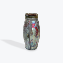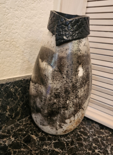 Wheel-thrown stoneware vase, Raku fired with multicolored mottled iridescent glazes.