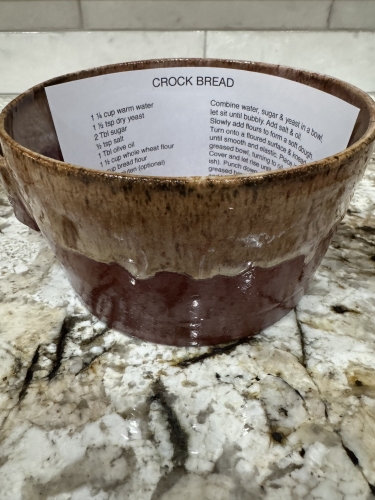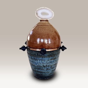 Lidded pot with crystal on the lid. It's in tones of cream and brown.