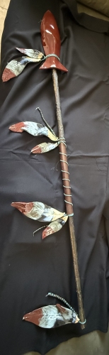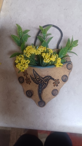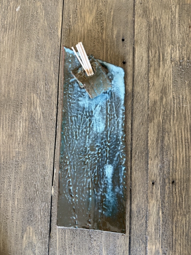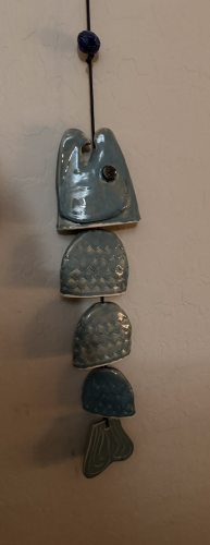Made of mixed clay and an extruder piece. The windchime features a small glass hummingbird. About 8 inches long.