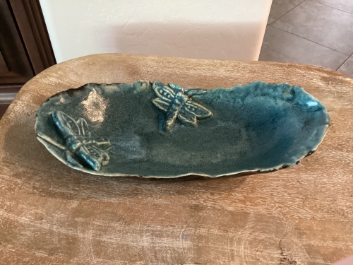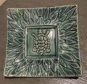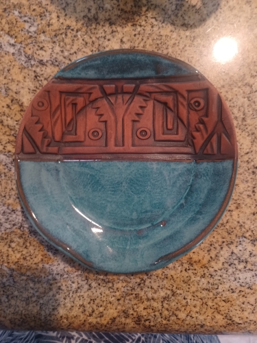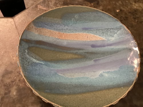 Large decorative platter comes with stand. Colors of sky blue, green, tan.
