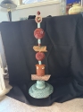 4 feet high. Indoor or outdoor decor.  Sits on floor with sturdy block. Rebar post is cemented into the block.  Pieces all assembled separately and are interchangable; they are numbered for the pictured arrangement.