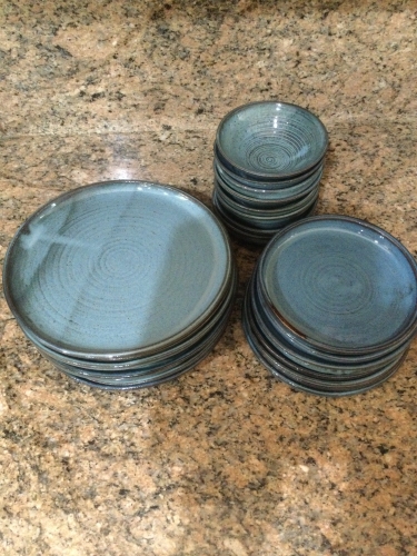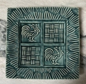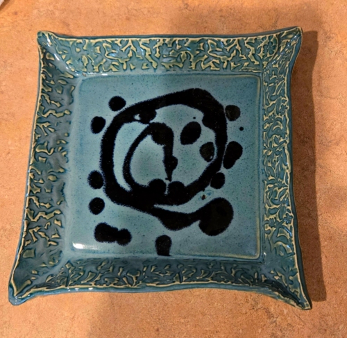 4 bowls 3 1/2” square and 1 tray 12 1/2 x 5” I. Italian straw and jade on brown clay.