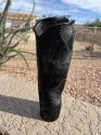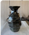 Wheel-thrown stoneware vase with taped design, Raku fired with lapis and bronze glaze.