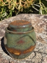 Wheel-thrown stoneware vase, Raku fired with mottled green and copper glazes, taped design, and bright red glaze stripe.