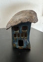 Large, decorative, lidded stoneware piece with vertical tiles. Measures 14 in tall x 10 in wide x 10 in deep. For decorative use only, water not recommended. Not food-safe.