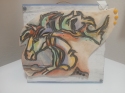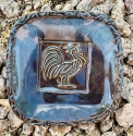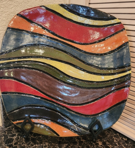 Large decorative platter comes with the stand. Dark black colors with peeks of other colors.