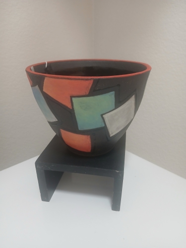 Wheel-thrown stoneware vasewith diamond pattern, Raku fired with Turquoise, Plum, and Copper colors.