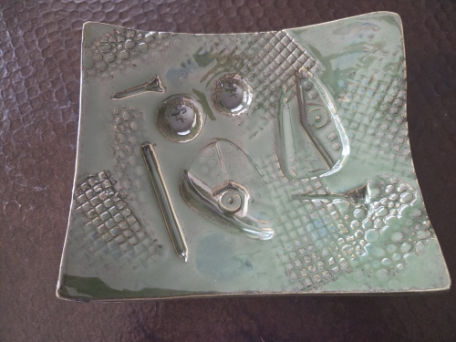 This is a green rectangular dish 6 1/2" X 8" X2" supported by four legs. It is impressed with golf related items...tee, balls, iron heads.