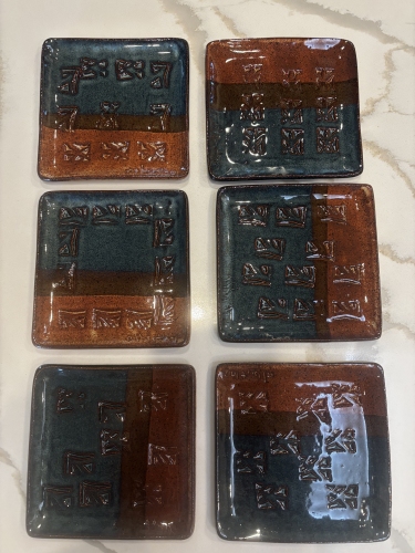 Wheel-thrown stoneware vase, Raku fired in copper and dark blue glaze, with bright red stenciled detail.