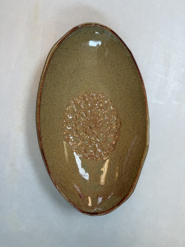 This large platter includes the stand and shows colors of brown, tan, and taupe.