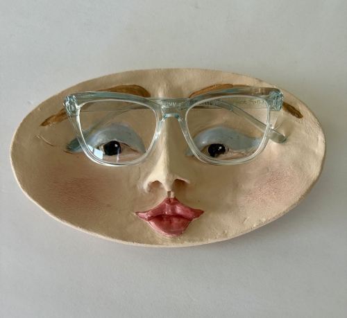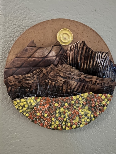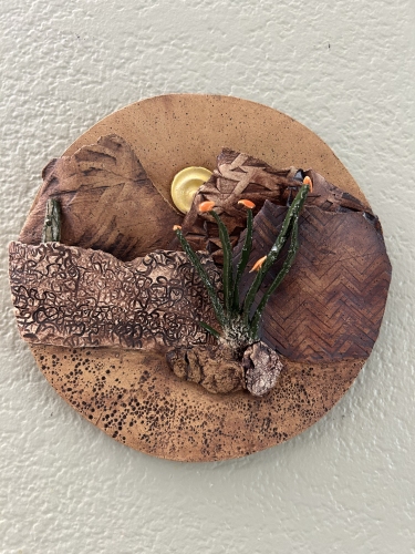 Desert landscape in an oval shape. It’s a sculptural relief.