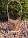 Bucket purse, spec buff, steer head front, red glaze inside.