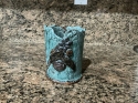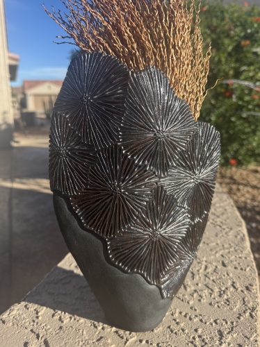 Vase done in desert sage glaze and Bernard slip on the flowers. Flower stamp on both sides. Beads on leather tie to finish it off.