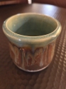 3 1/2" diameter X 3" tall copper bowl with green glaze drippings down the sides.
