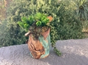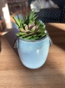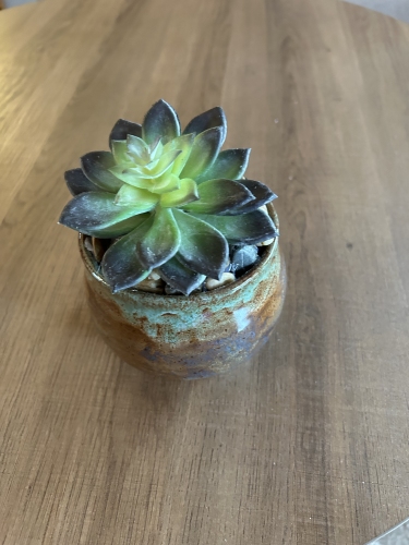 Brown, green vase with succulent vase, measures 5 x 5 inches