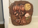 Large decorative platter shows colors of tan, white, black, ivory. Stand included.