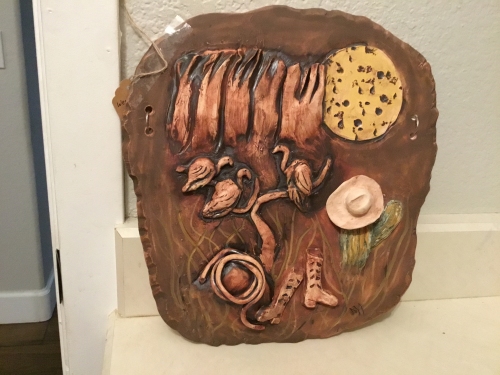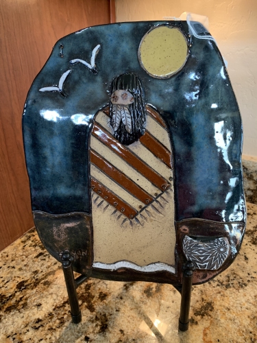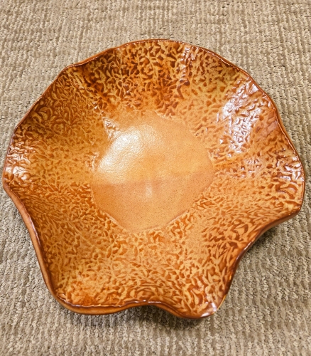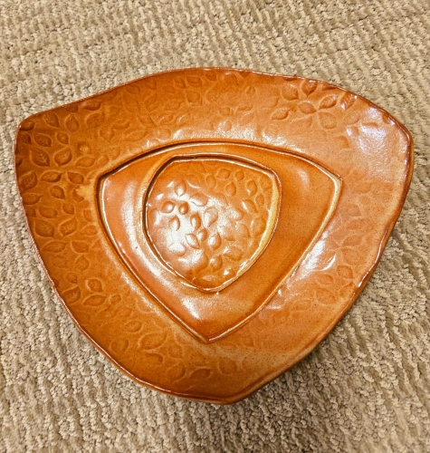 Plate is 8X10" in rich copper glaze reminiscent of the petrified ginkgo veins of the Pacific Northwest.