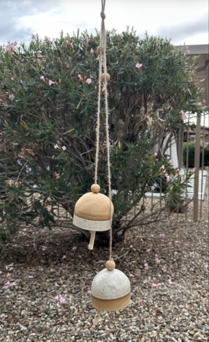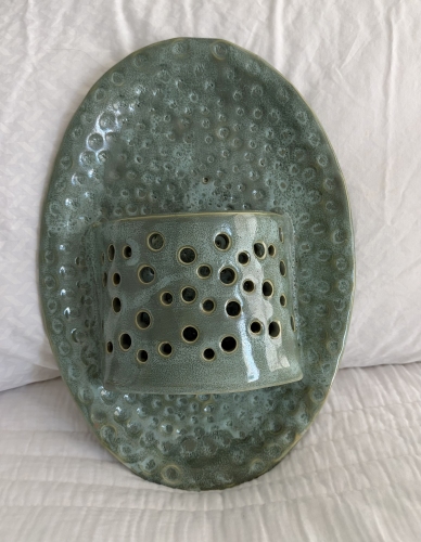 2 pieces- top for butter, bowl for water. 3” x4” ; maycoshino glaze with oatmeal splashes.