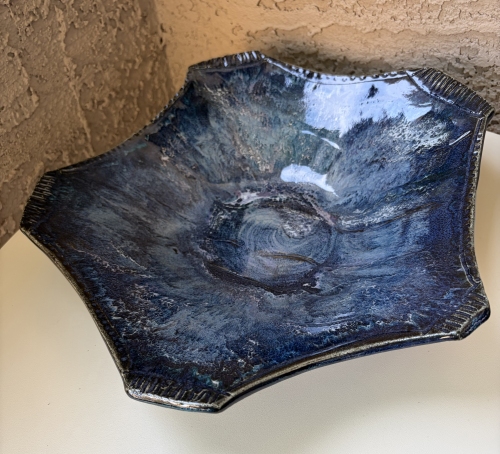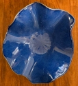 Leaf shaped bowl using various blue glazes. Measures 13” x 7”. Food safe.